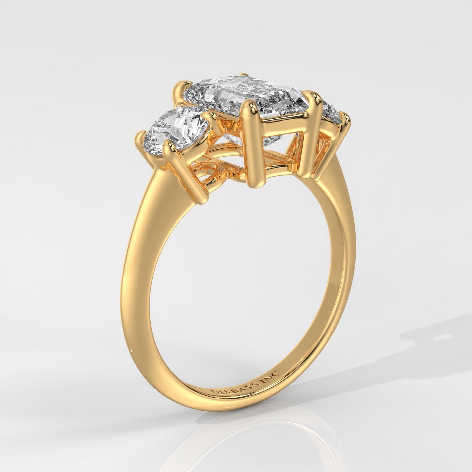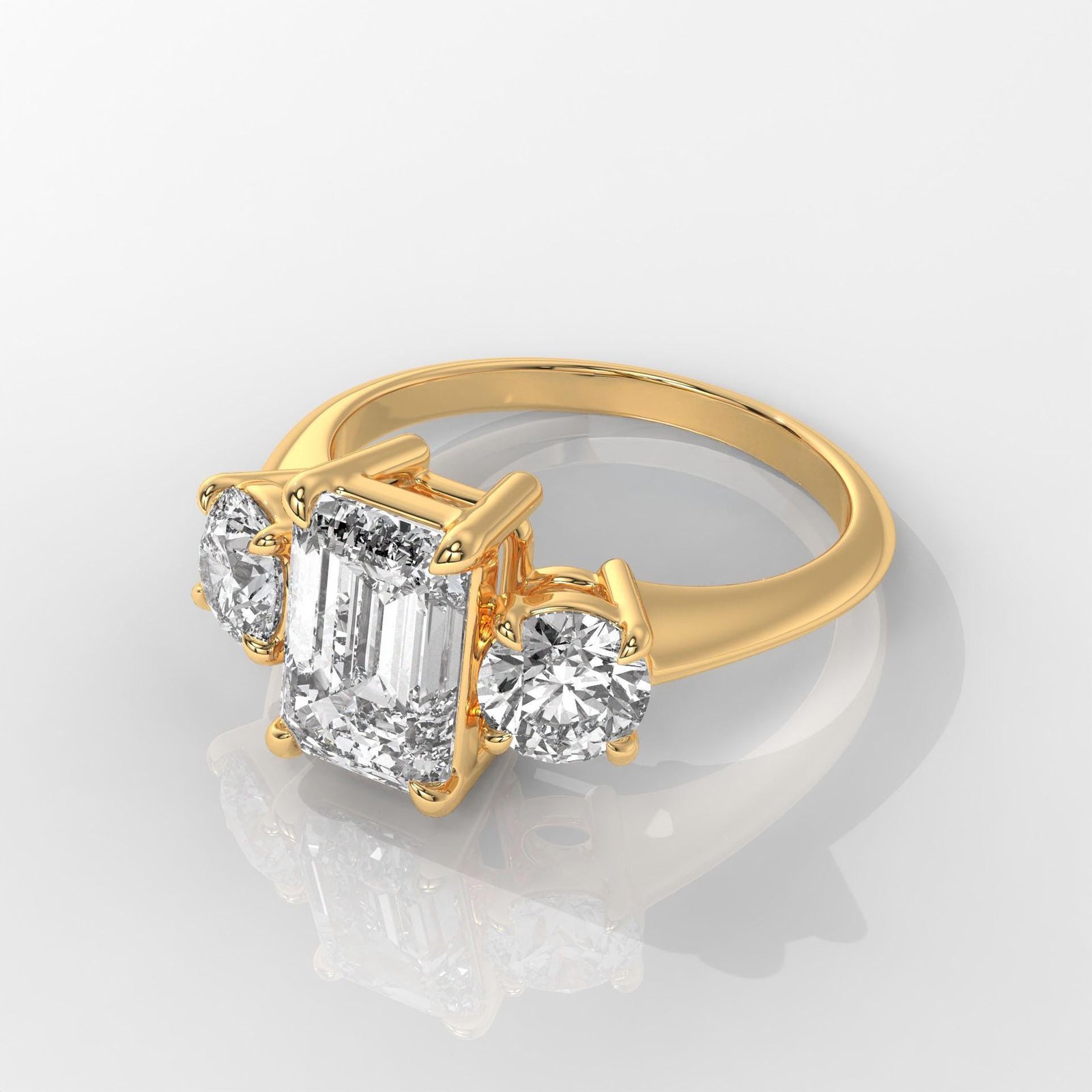 Elegant Emerald Cut Three-Stone Diamond Ring by OTP Jewelry, featuring a certified lab-grown diamond center stone with two brilliant round side diamonds, set in 14K gold. A timeless symbol of love and sophistication, perfect for engagements and anniversaries.