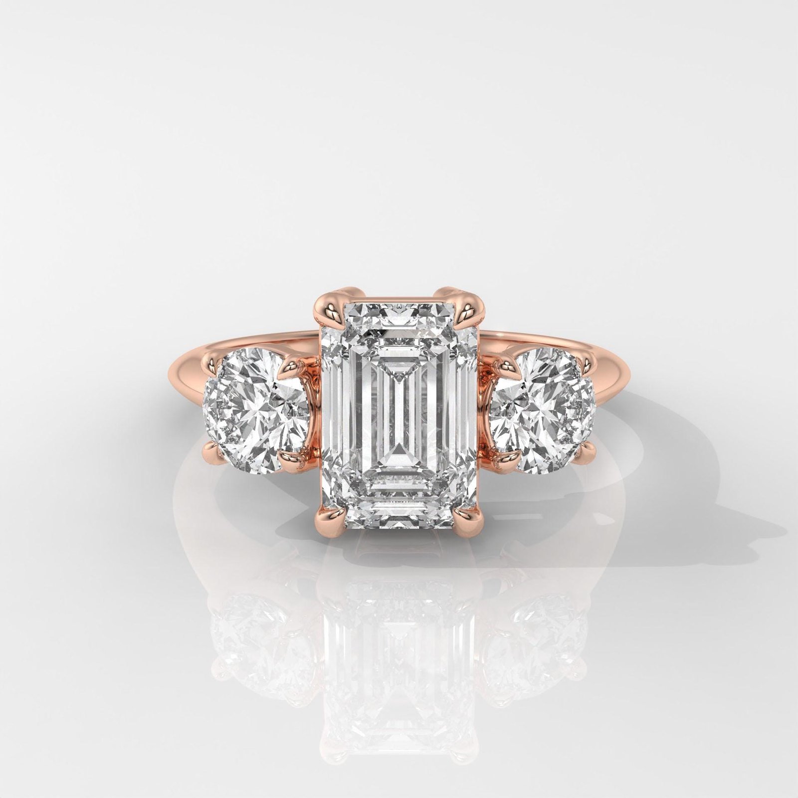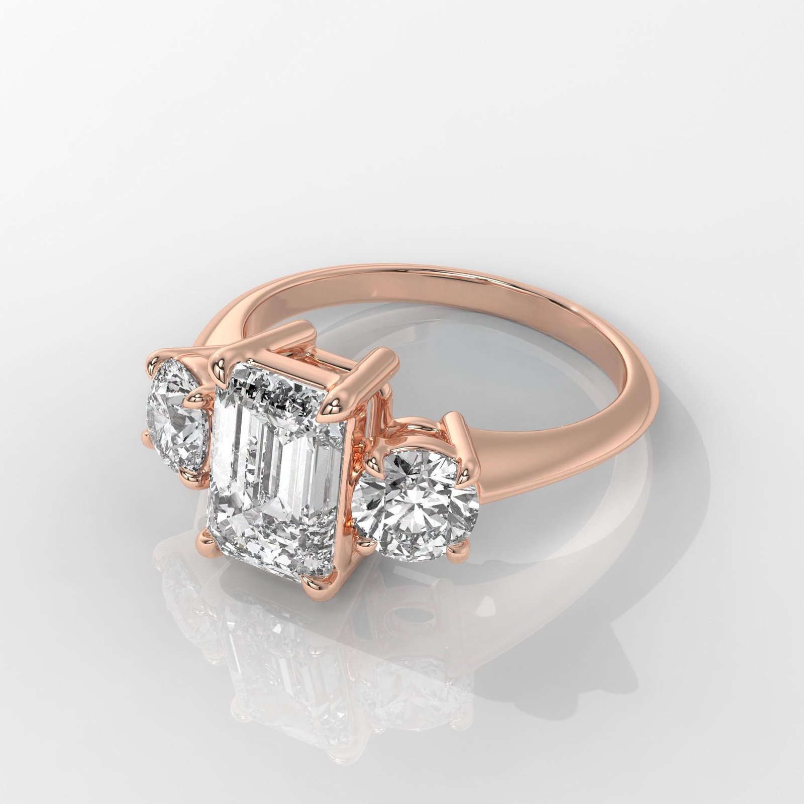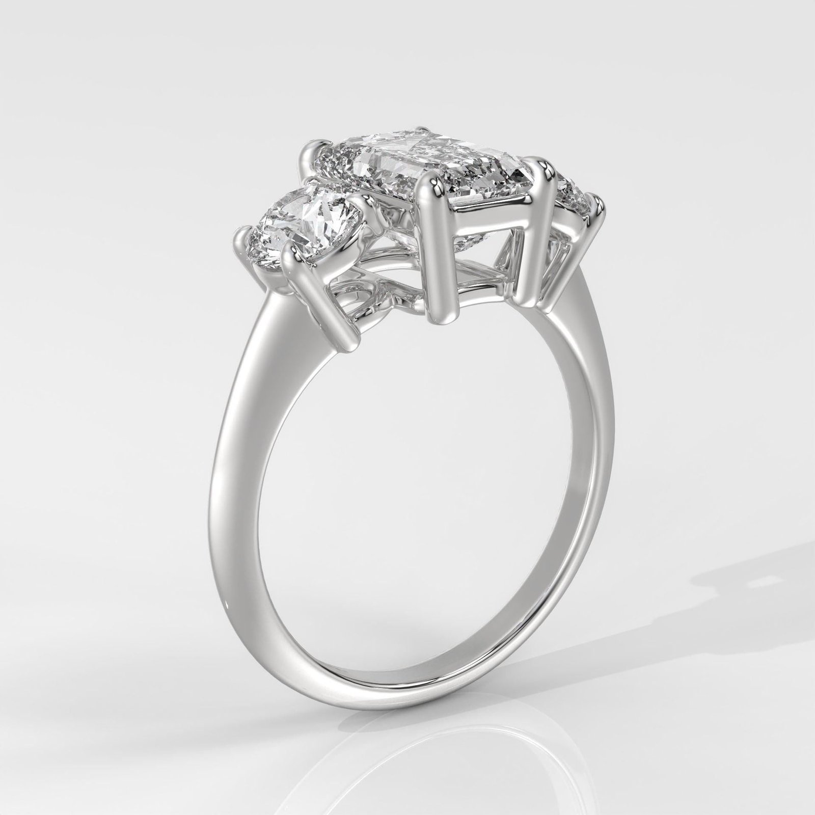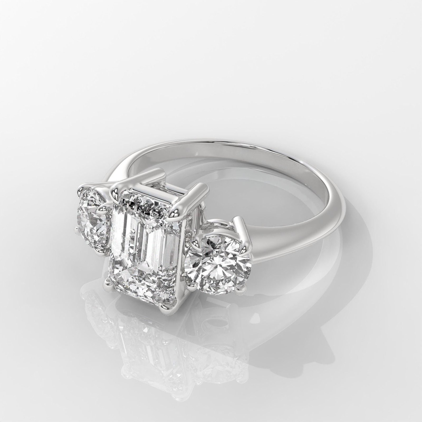 Celebrate your love with the Emerald Cut Three-Stone Diamond Ring by OTP Jewelry, a masterpiece of elegance and craftsmanship. This stunning ring showcases a brilliant emerald-cut lab-grown diamond at the center, gracefully flanked by two round brilliant side diamonds, creating a captivating balance of sparkle and sophistication.