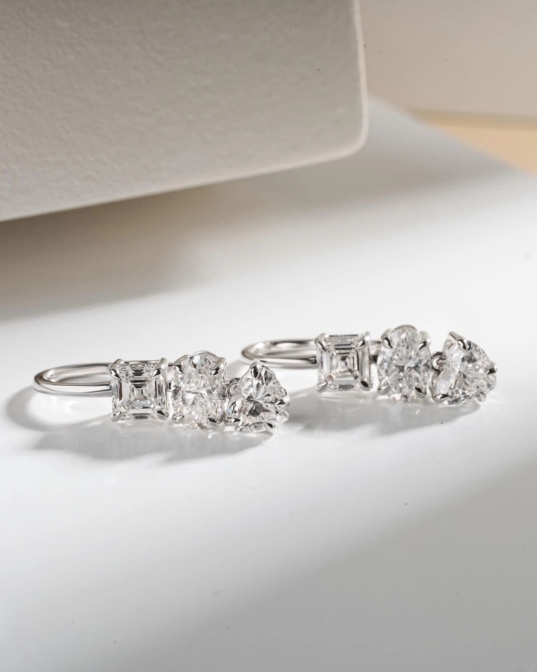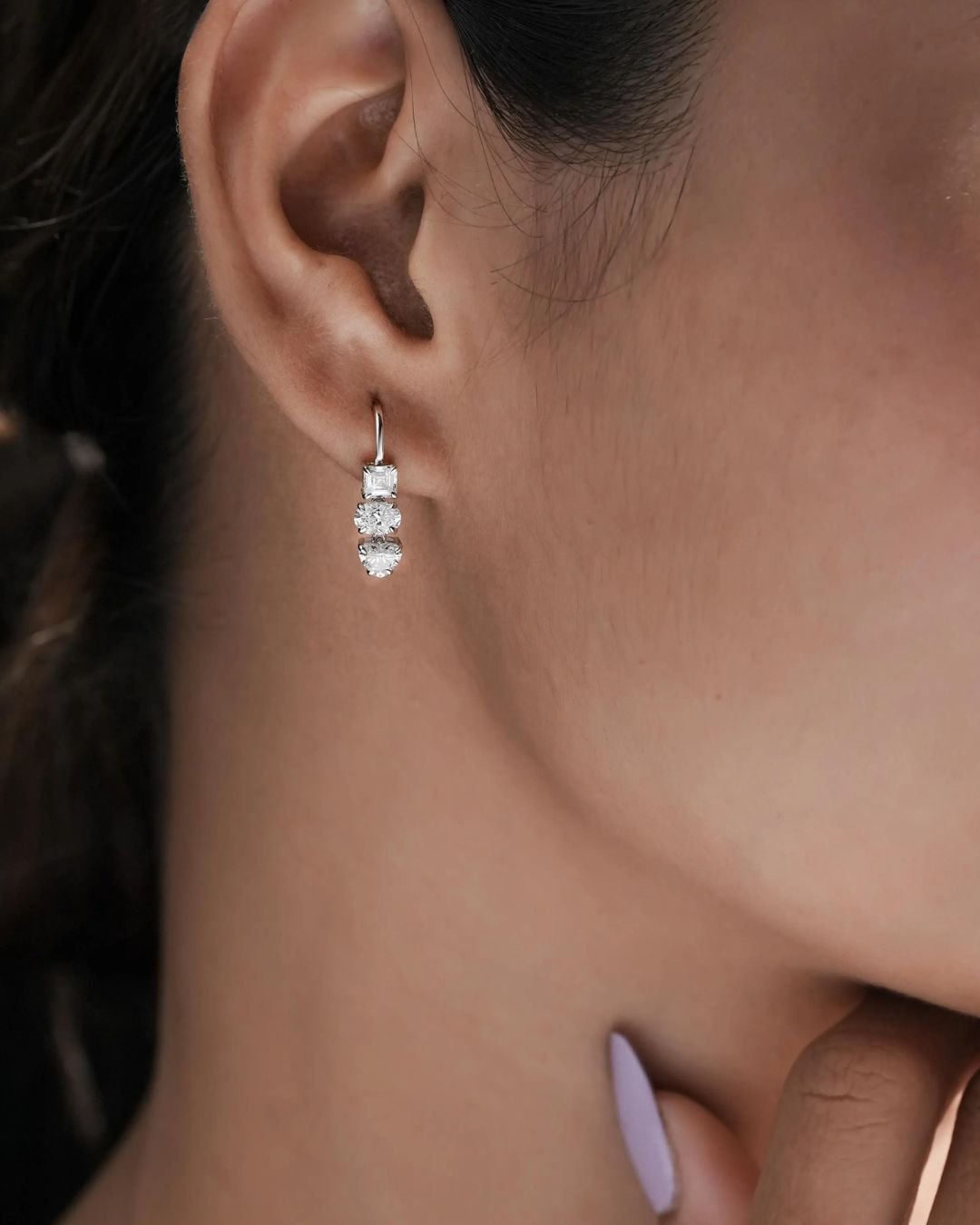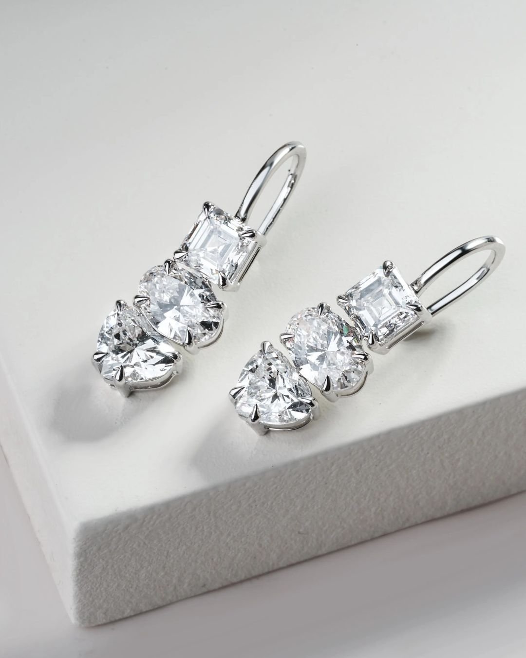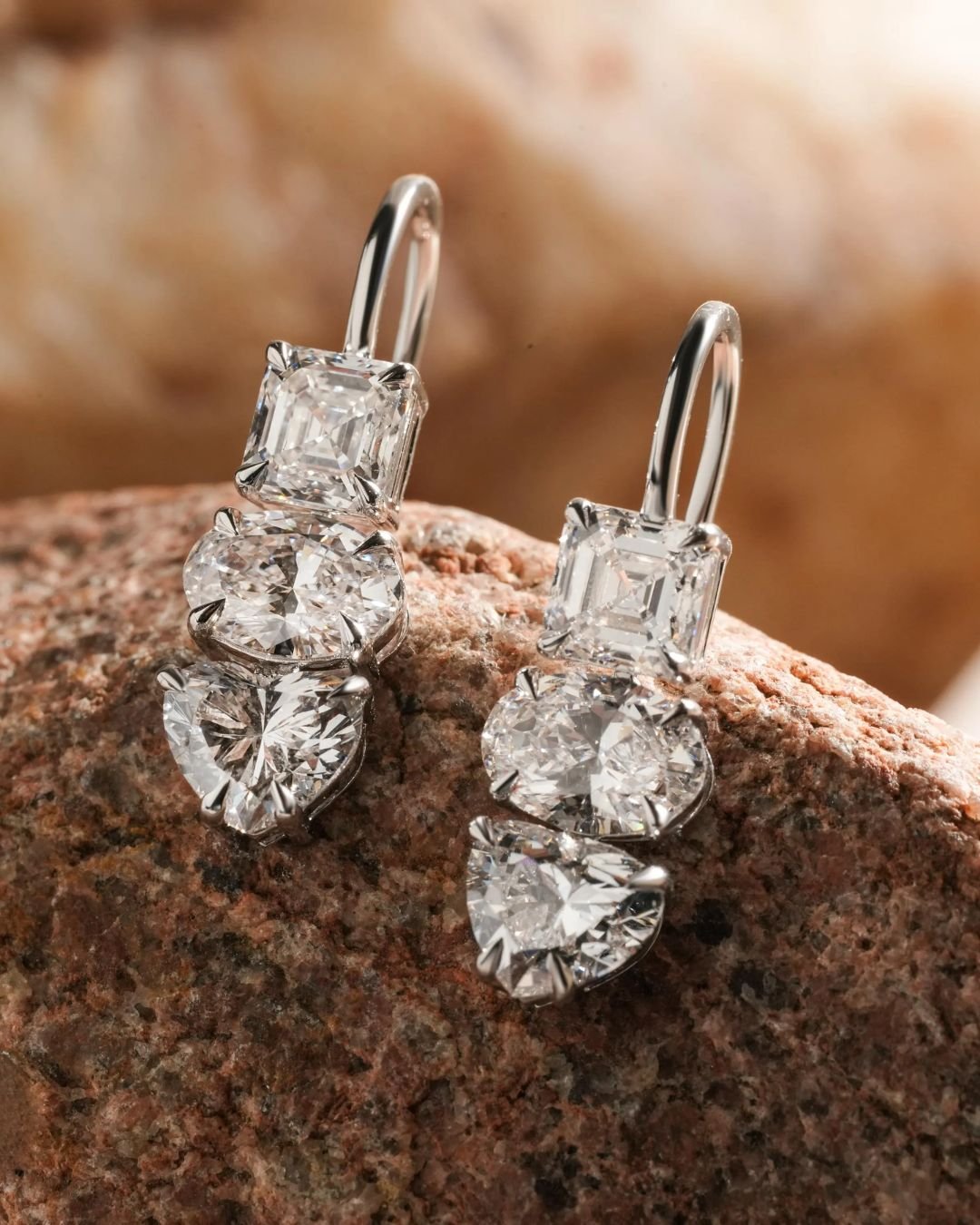 These stunning Lab Grown Diamond Earrings combine classic elegance with contemporary flair, featuring a trio of premium diamond shapes Asscher, Oval, and Heart all set in your choice of solid 14K White or Yellow Gold.