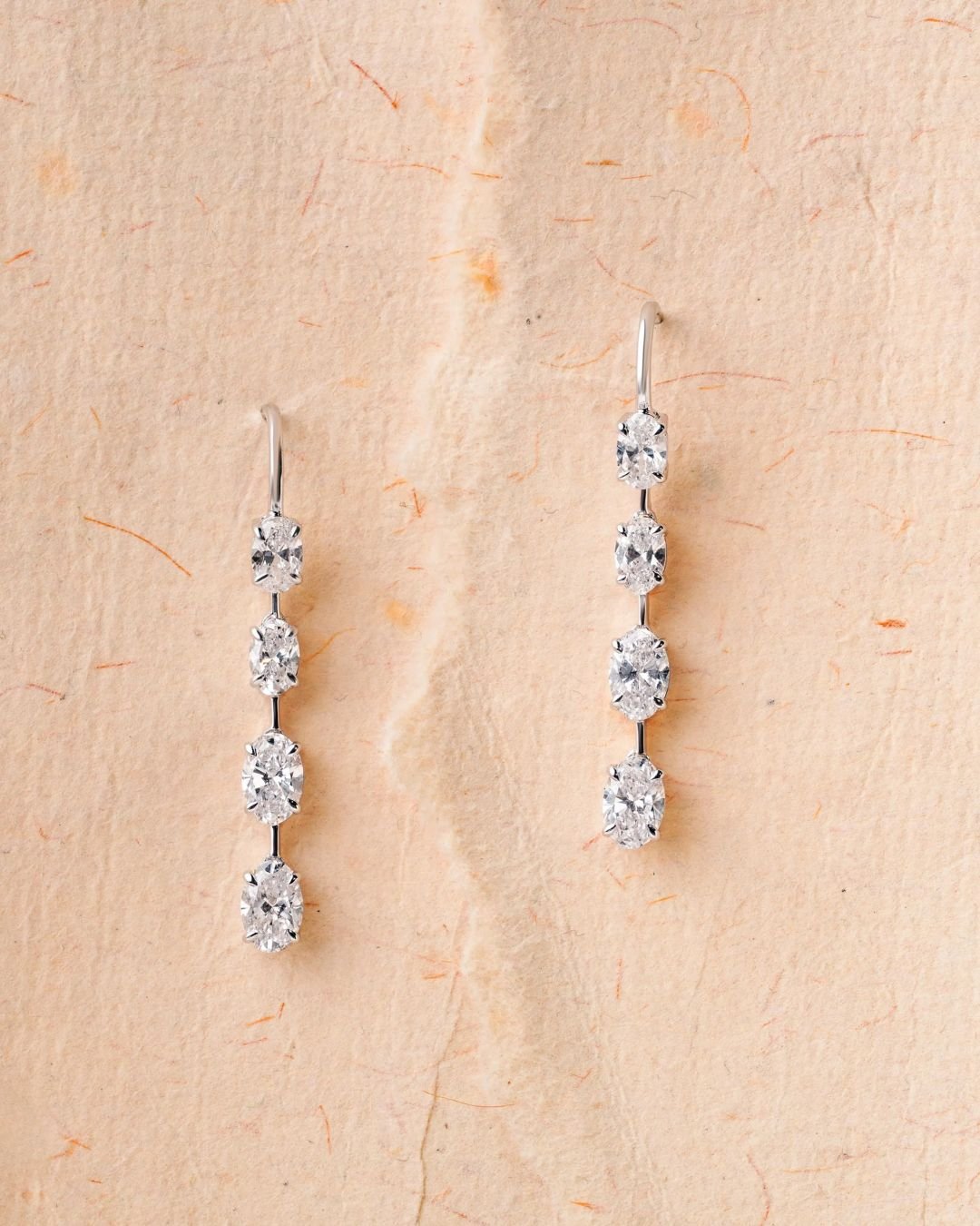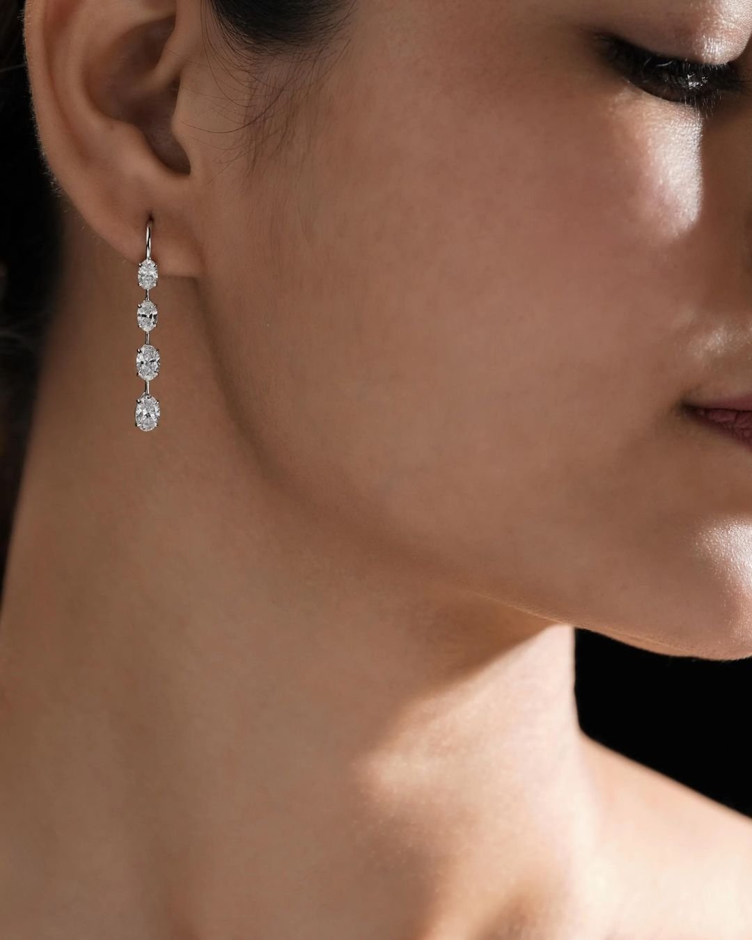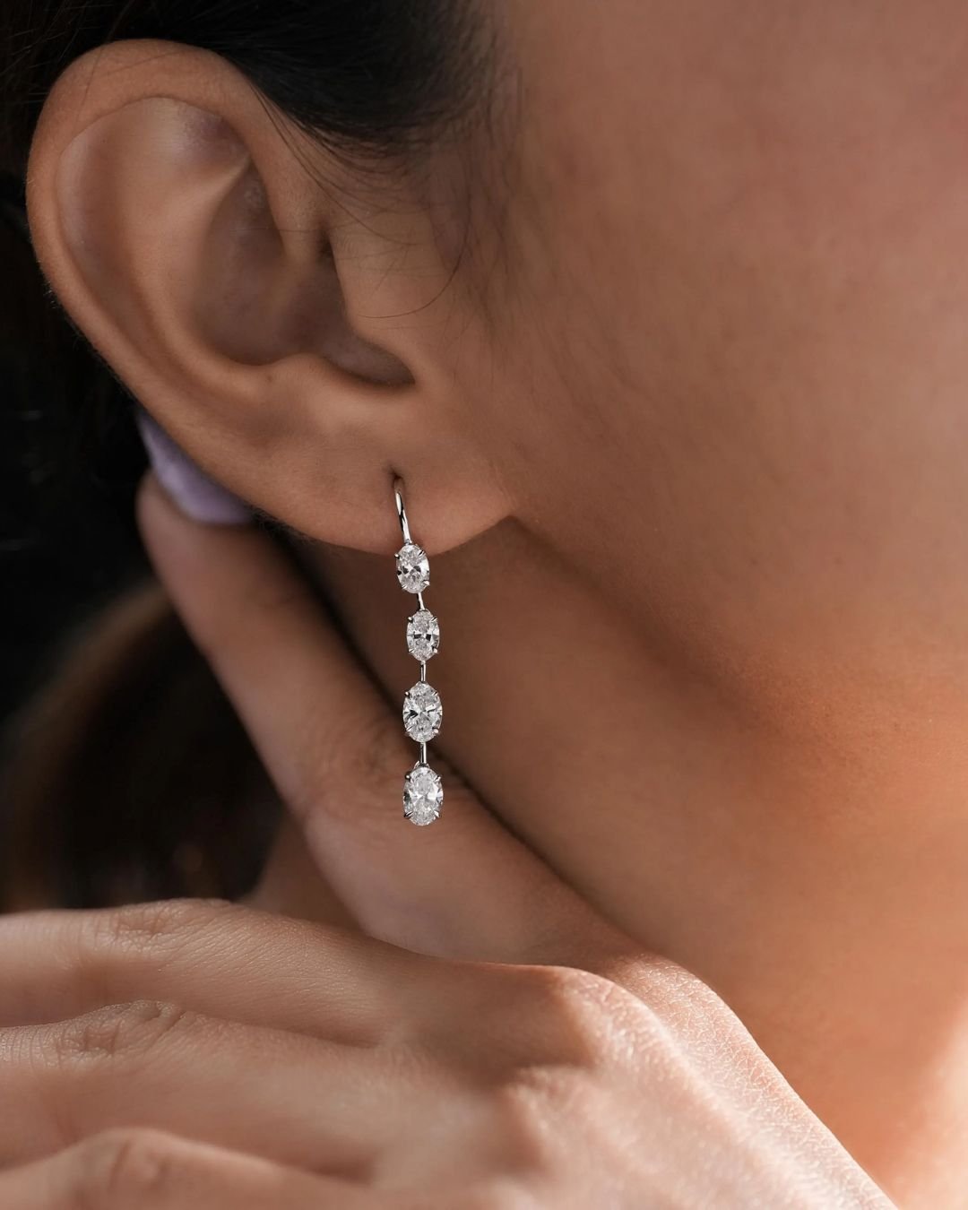 Elegant 14K Gold Dangle Earrings with Oval CVD Lab Grown Diamonds. Total 2.5 CT of sparkle in a classic 4-prong setting. DEF color, VVS–VS clarity. Made to order & customizable.