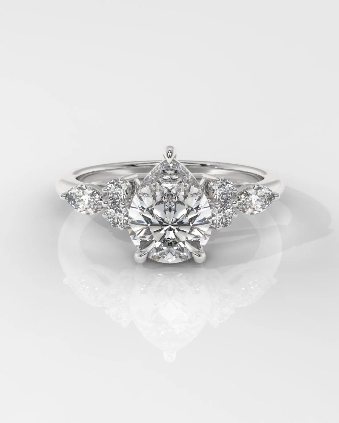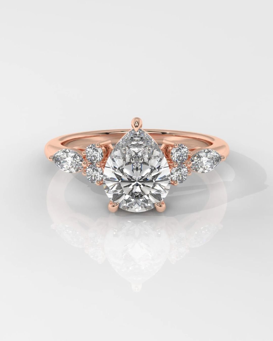 Featuring a stunning Pear Brilliant lab-grown diamond with Round & Marquise side stones, this 14K gold ring shines with DEF/VVS–VS quality and certified brilliance. A radiant symbol of love and elegance.