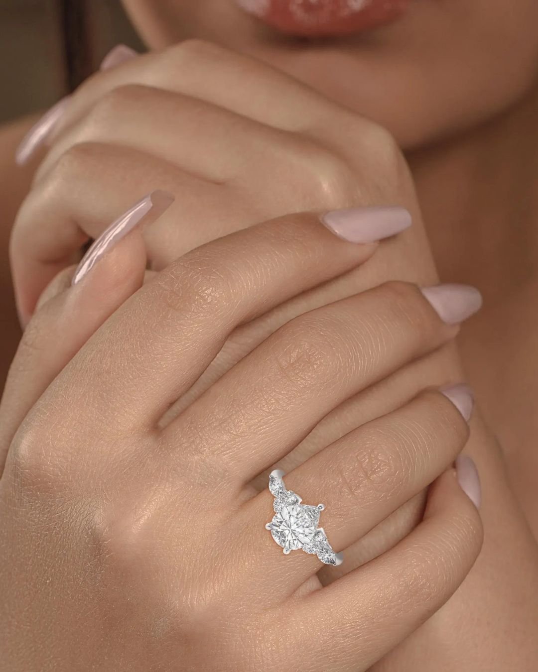 Complemented by a harmonious arrangement of Round Brilliant and Marquise Brilliant side stones, each diamond in this ring is carefully selected for its exceptional quality. All stones are lab grown, ensuring ethical sourcing, and come with DEF color and VVS–VS clarity the highest standards of beauty and brilliance.
