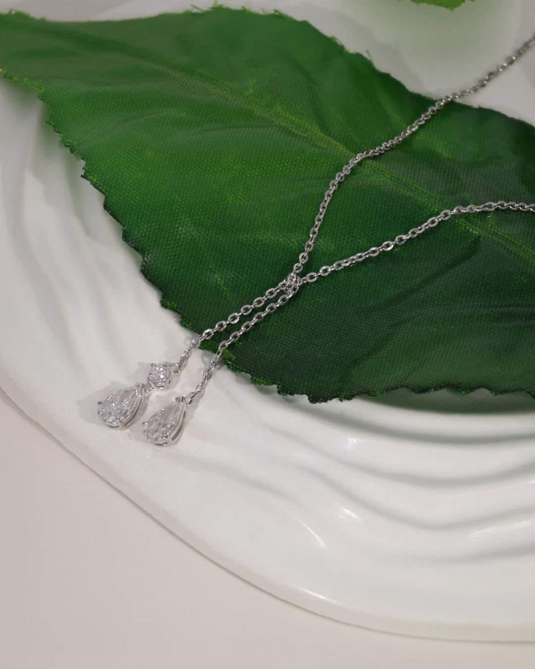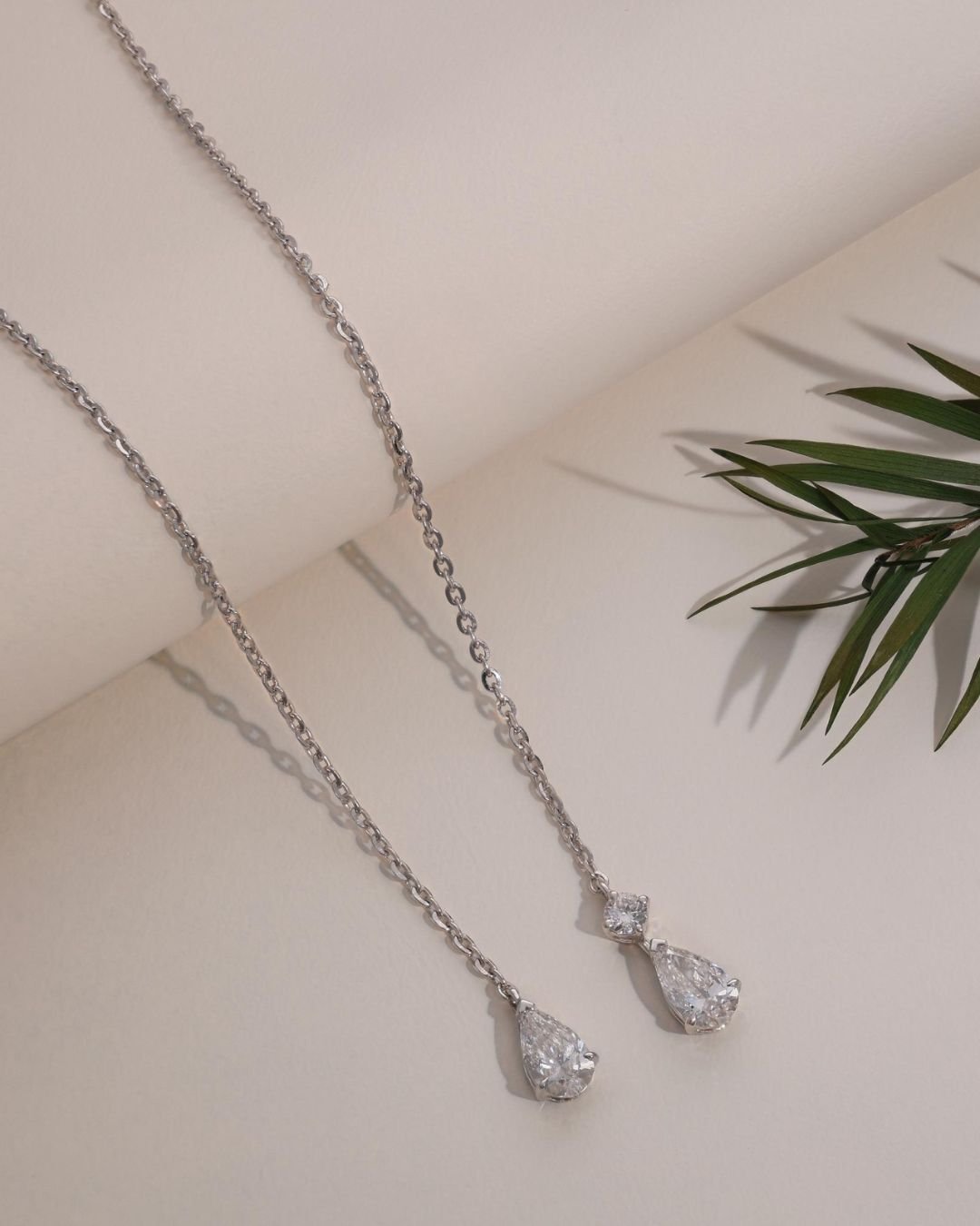 Make a statement with this stunning Pear Cut Lariat Necklace, featuring a unique blend of 2 pear brilliant and 1 round brilliant diamonds, totaling 1.08 carats of exquisite sparkle. Each diamond is carefully selected for its premium DEF color and VVS-VS clarity, ensuring exceptional brilliance and fire.