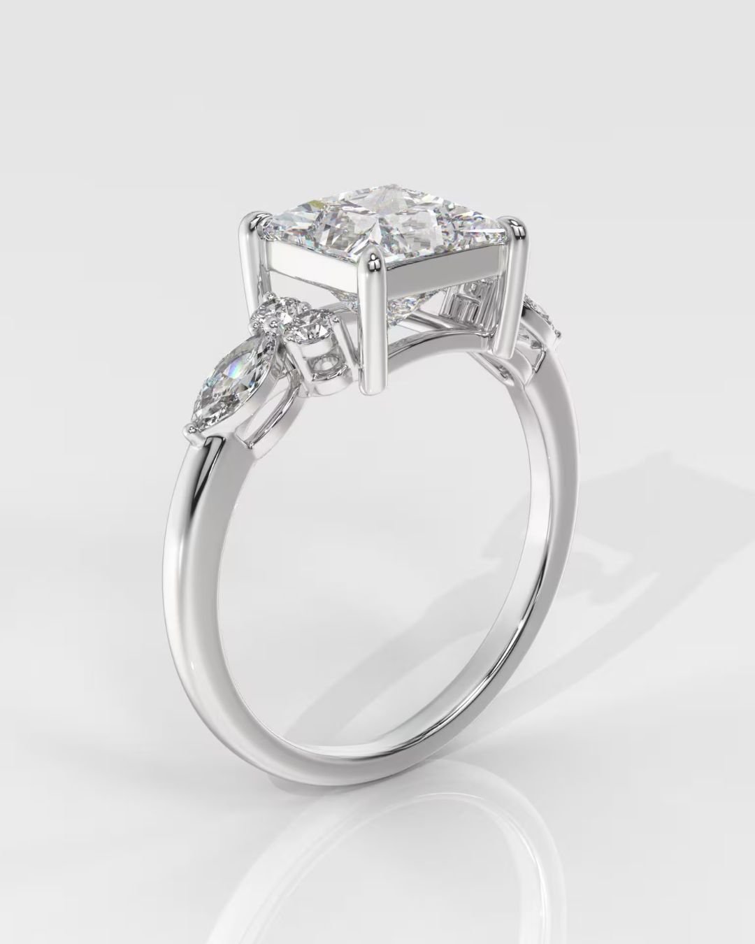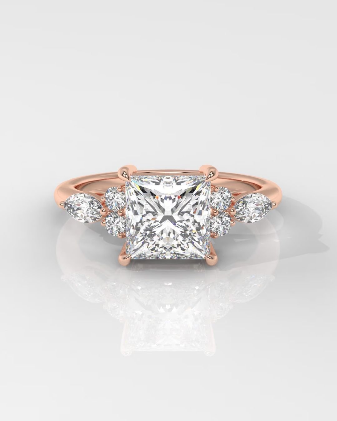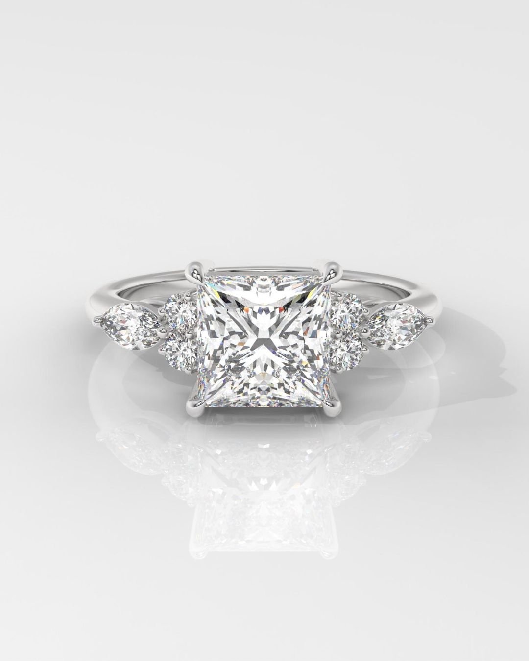 Make your moment unforgettable with this elegant and sustainable 14K gold engagement ring, featuring a breathtaking Princess Brilliant lab-grown diamond at the center. IGI certified and available in a range of carat weights, this center stone is beautifully framed by a combination of Round Brilliant and Marquise Brilliant side stones each selected for their superior DEF color and VVS–VS clarity.