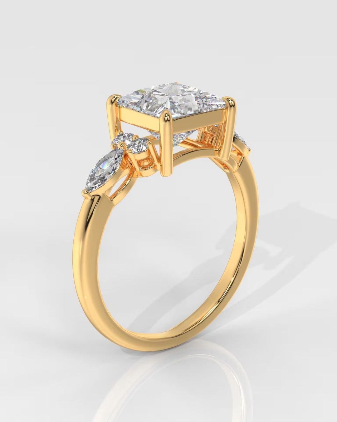 This handcrafted 14K gold engagement ring features a stunning Princess Brilliant lab-grown diamond (1–3.5 CT, IGI certified) at its center, accented by Round and Marquise Brilliant side stones. Ethically made, fully customizable, and crafted to order for a timeless, elegant look.