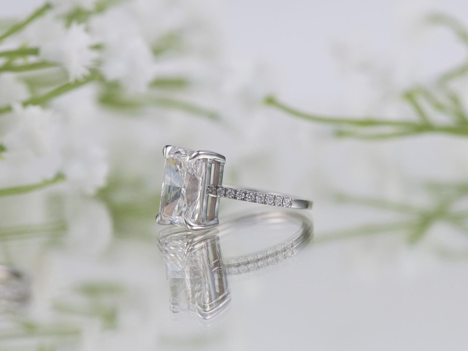 The radiant cut blends the fire of a round brilliant with the elegant outline of an emerald cut, offering unmatched sparkle and sophistication. Paired with the delicate brilliance of a pave band, this ring reflects both timeless beauty and contemporary design.