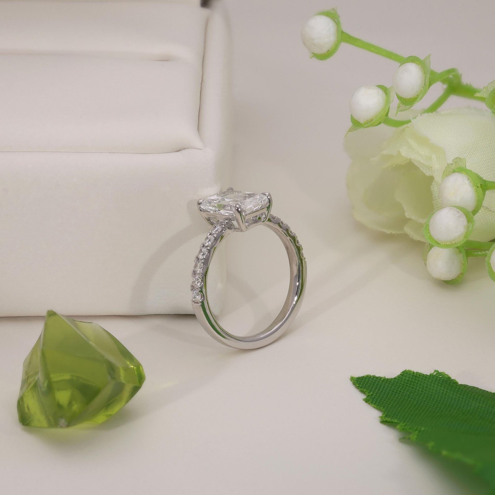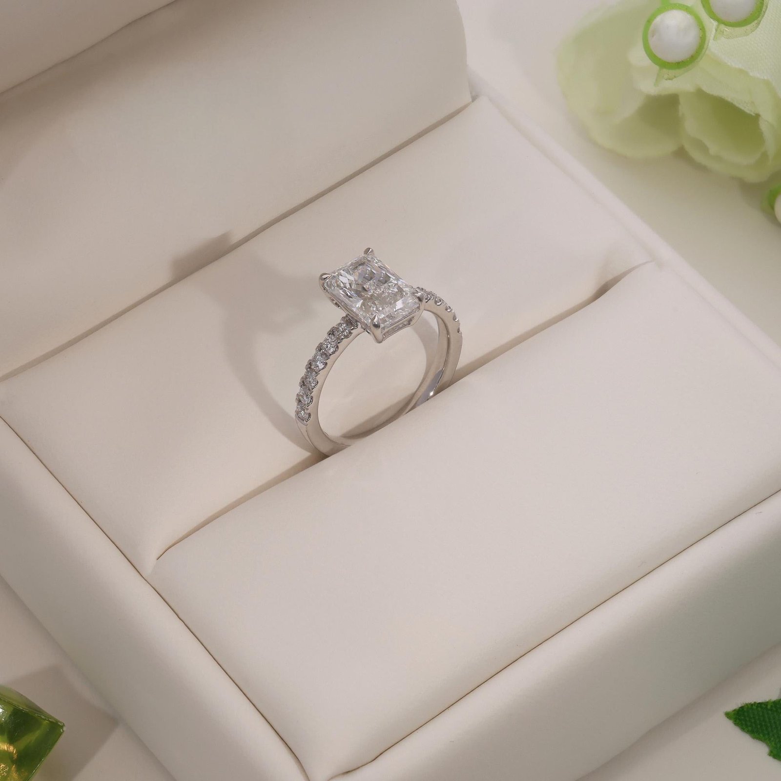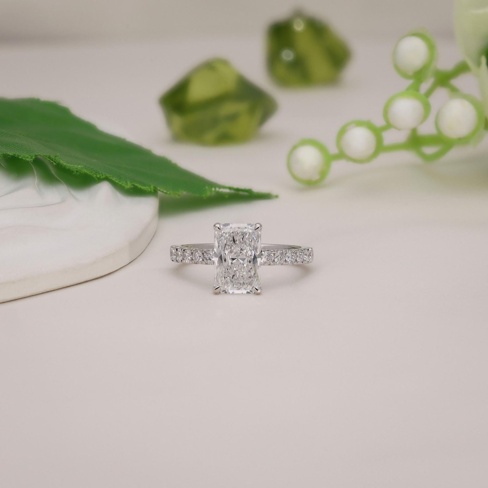 Make your proposal unforgettable with our 14K White Gold Radiant-Cut Lab-Grown Diamond Engagement Ring ? a design that combines bold sparkle with elegant sophistication. The radiant-cut diamond, known for its striking brilliance and rectangular shape, takes center stage as the perfect modern classic. Complementing the centerpiece, a pave-set band of round brilliant diamonds adds extra shimmer, making this ring a true symbol of everlasting love.