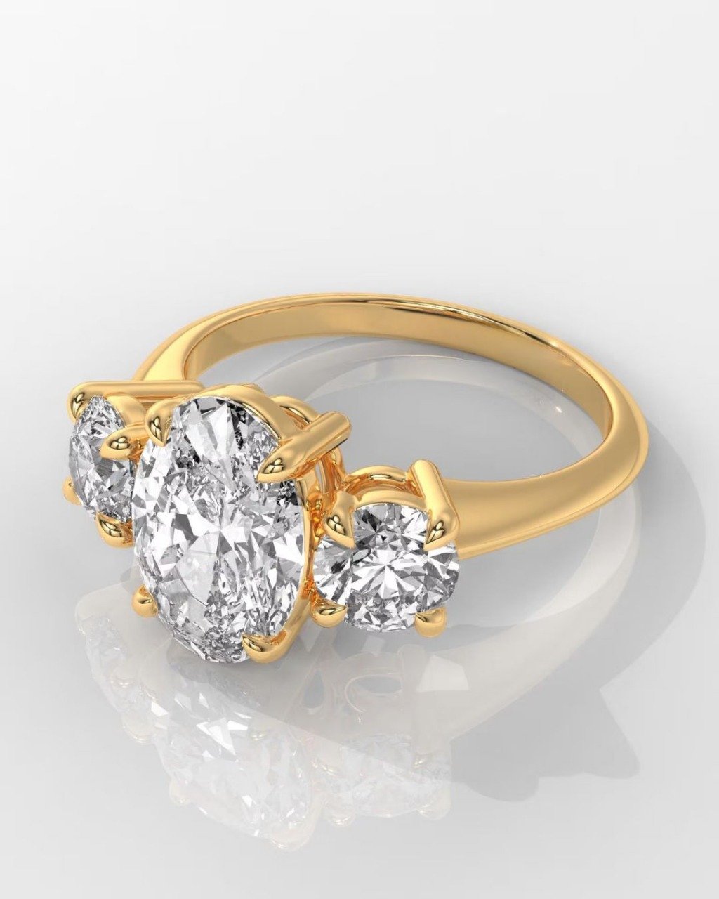 A timeless three-stone engagement ring featuring a Round Brilliant IGI-certified lab-grown diamond center stone, flanked by matching round side stones. Crafted in radiant 14K gold with DEF/VVS–VS quality.