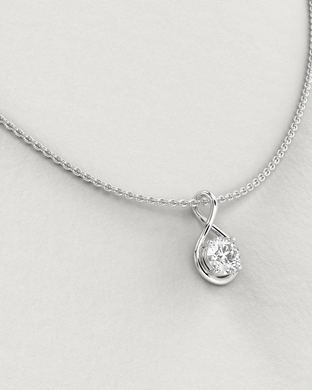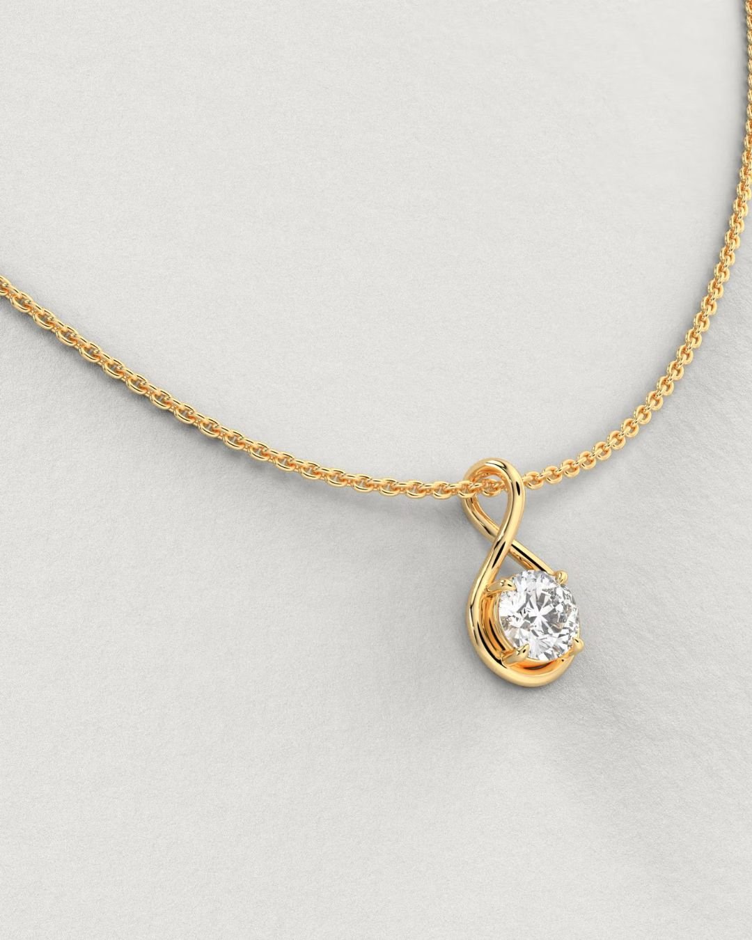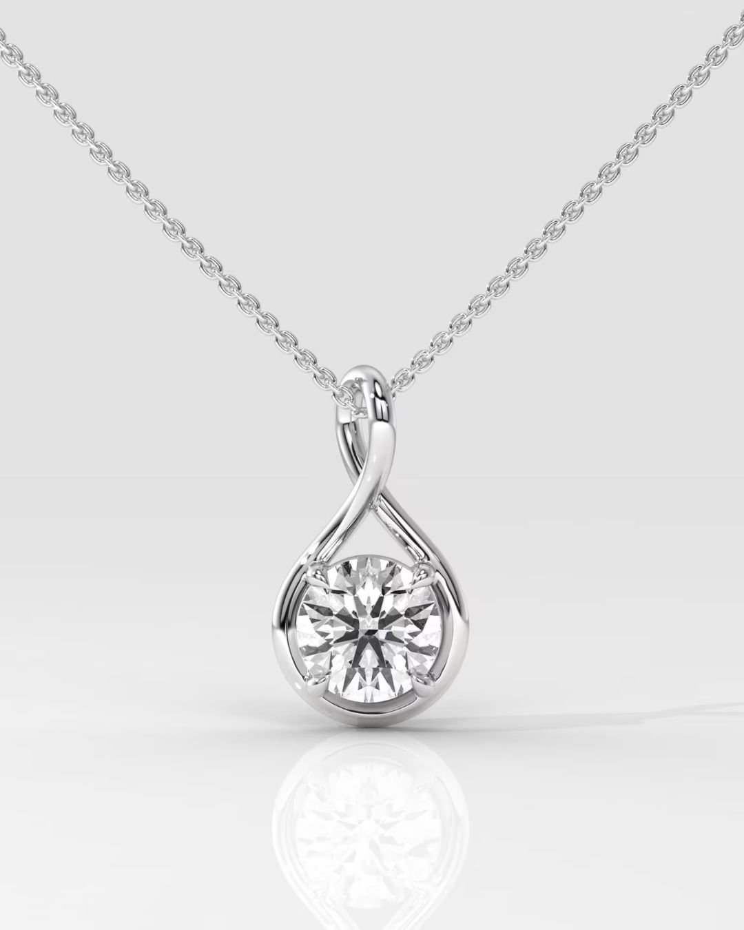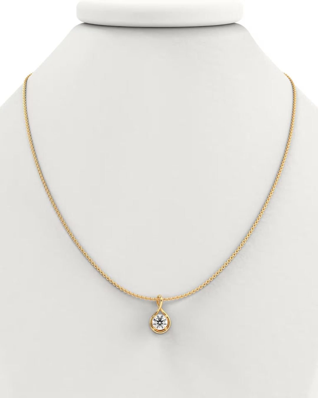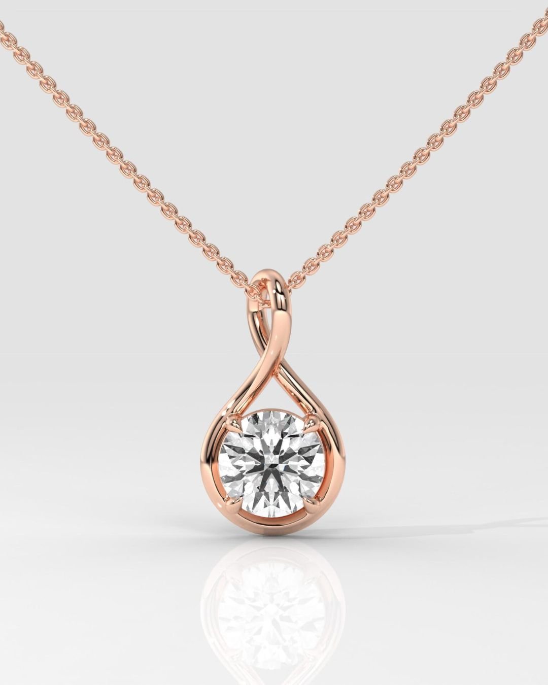Elegant Twisted Round Brilliant Solitaire Lab Grown Diamond Pendant in 14K Gold. IGI Certified, customizable diamond size & chain length. Available in White, Yellow, or Rose Gold.